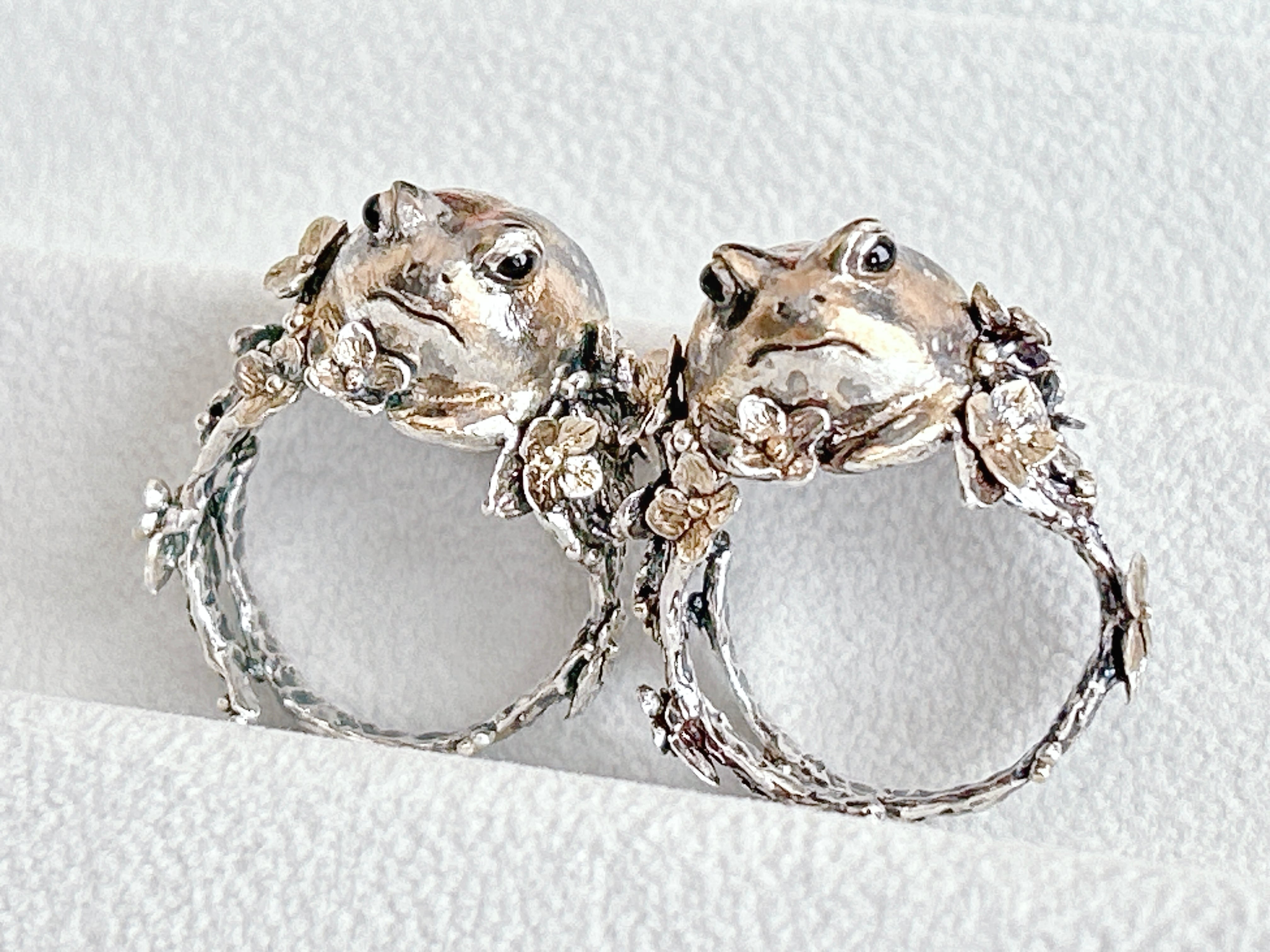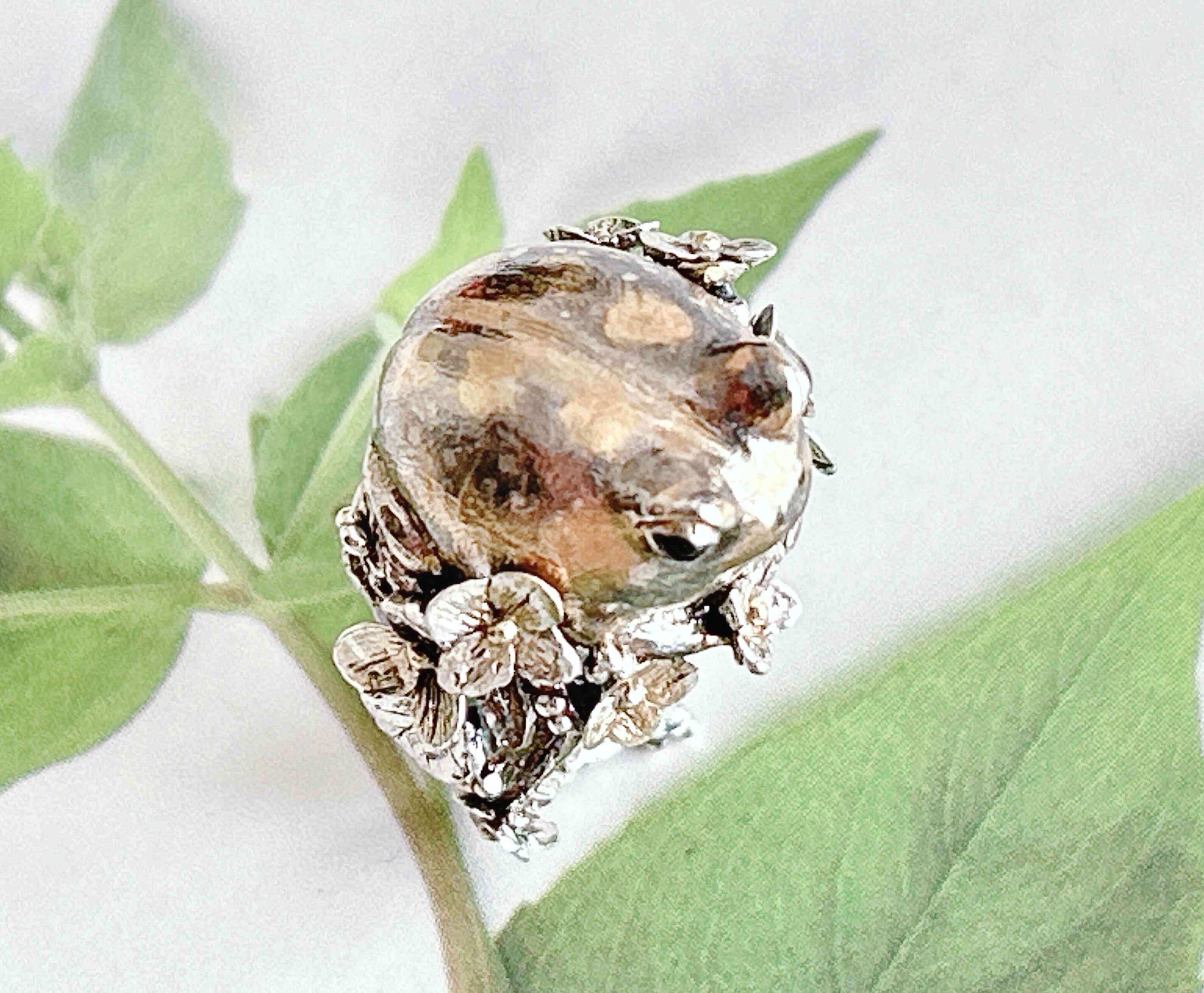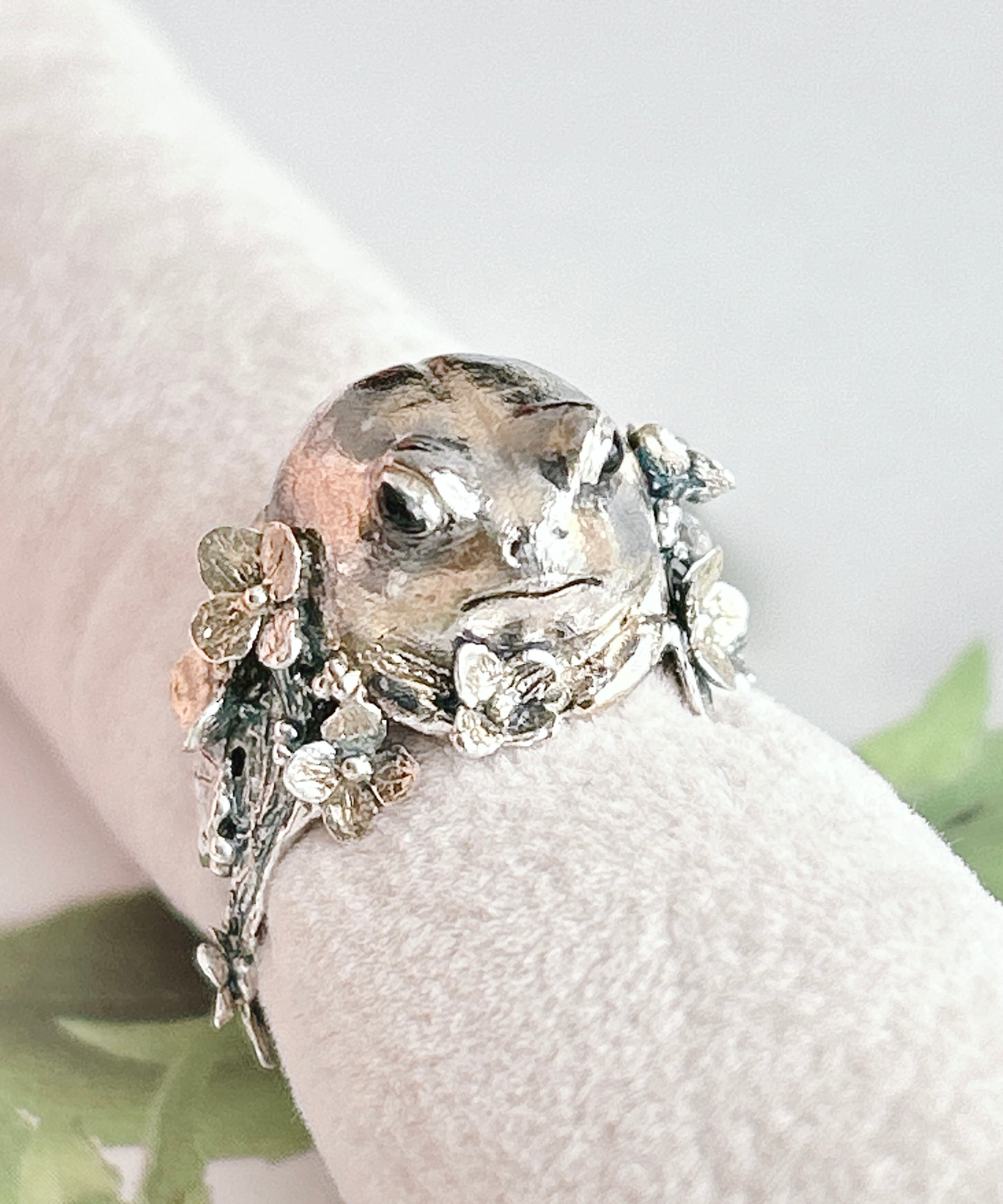 アメフクラガエルに紫陽花の花を散りばめたリング。