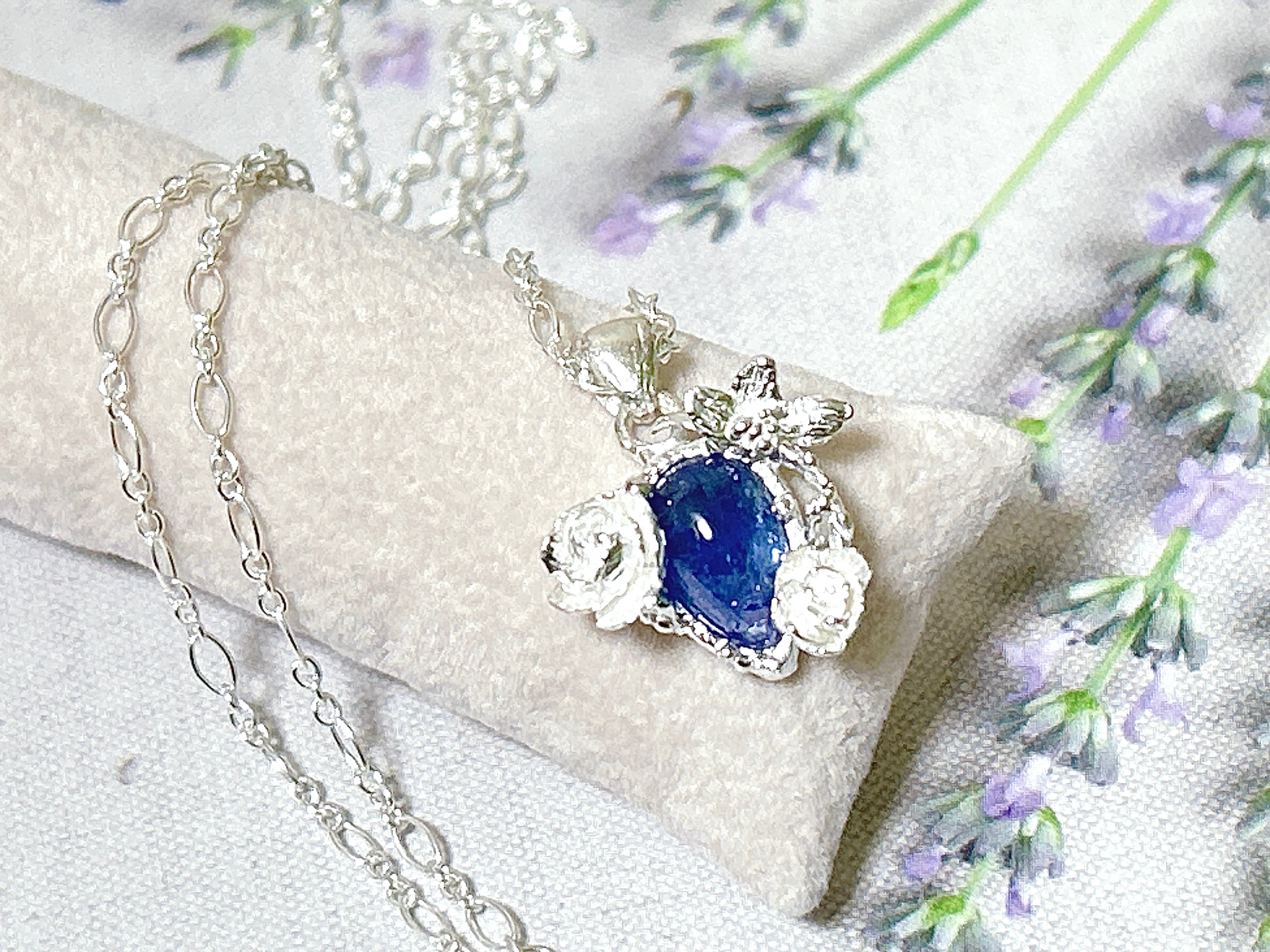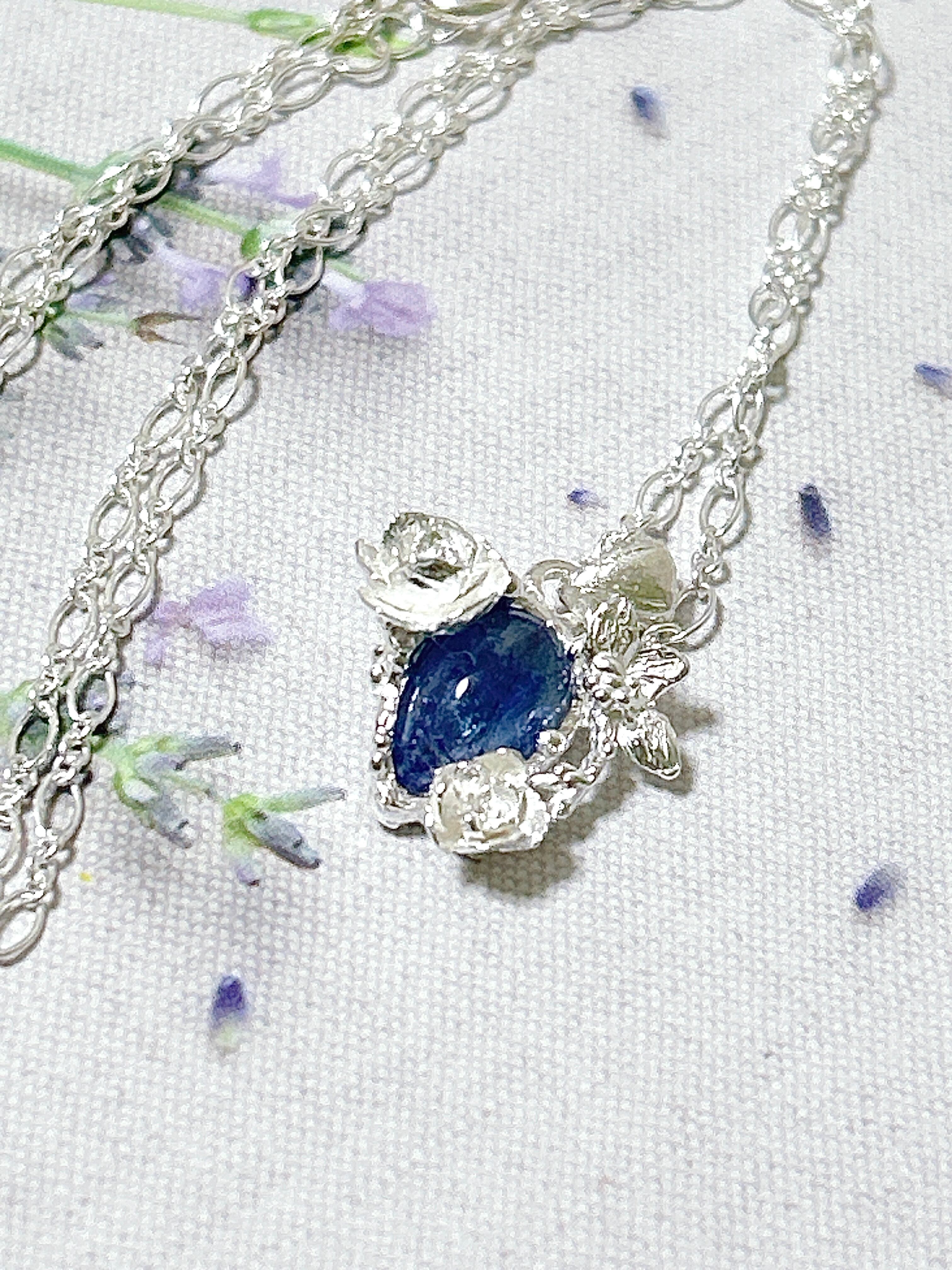 深みのある綺麗な青のタンザナイトに、クリスマスローズを添えたネックレスです。
