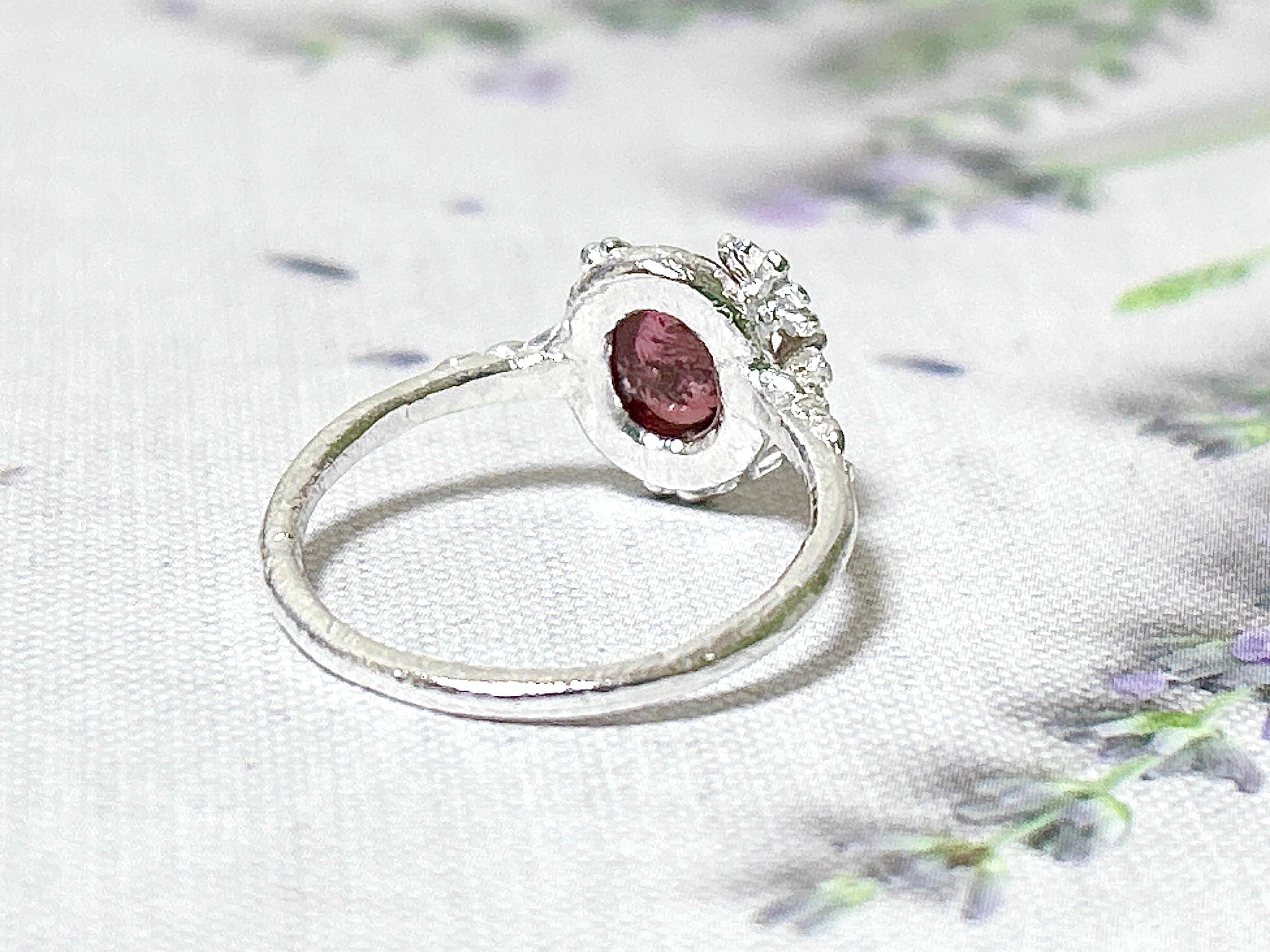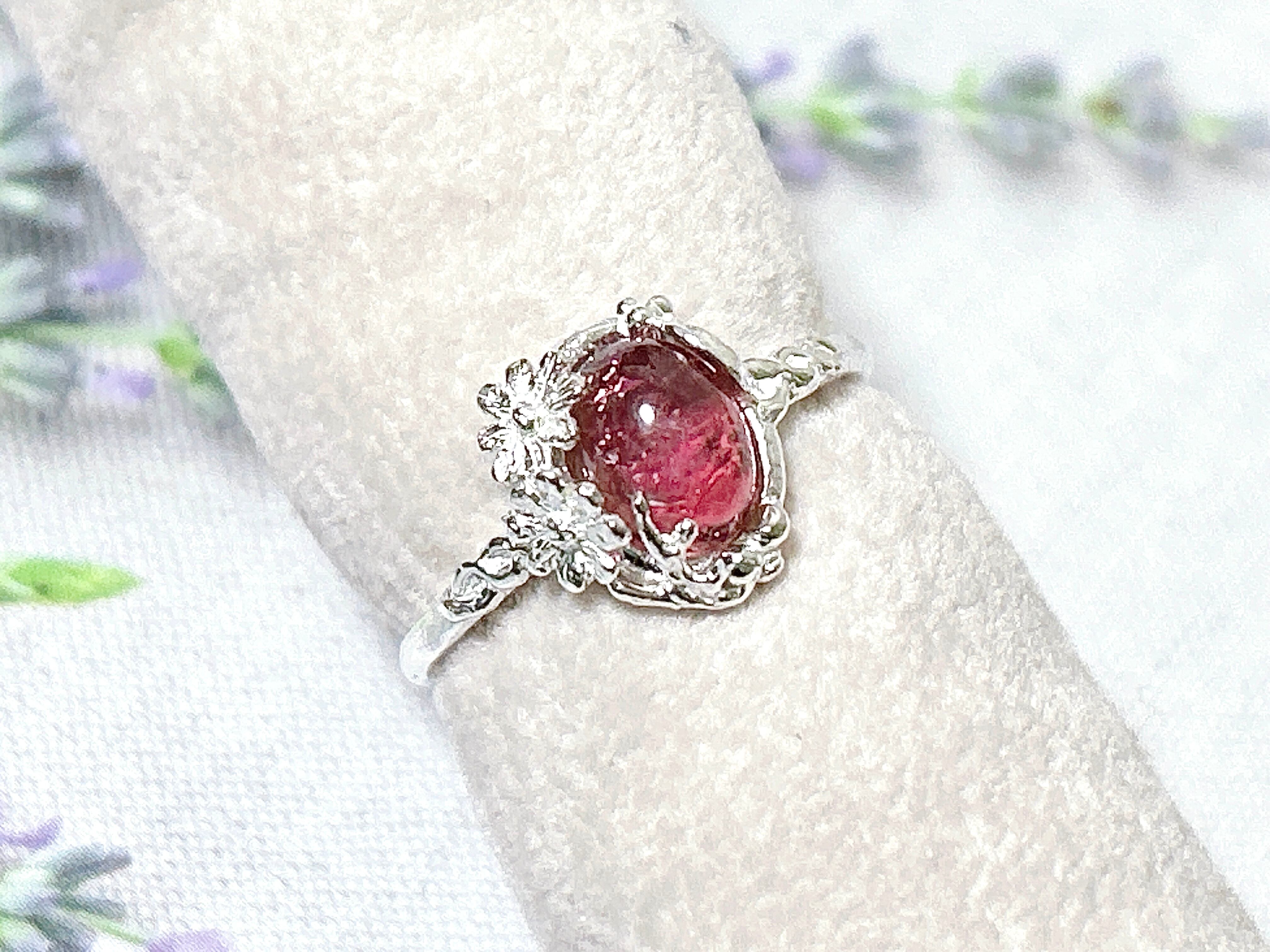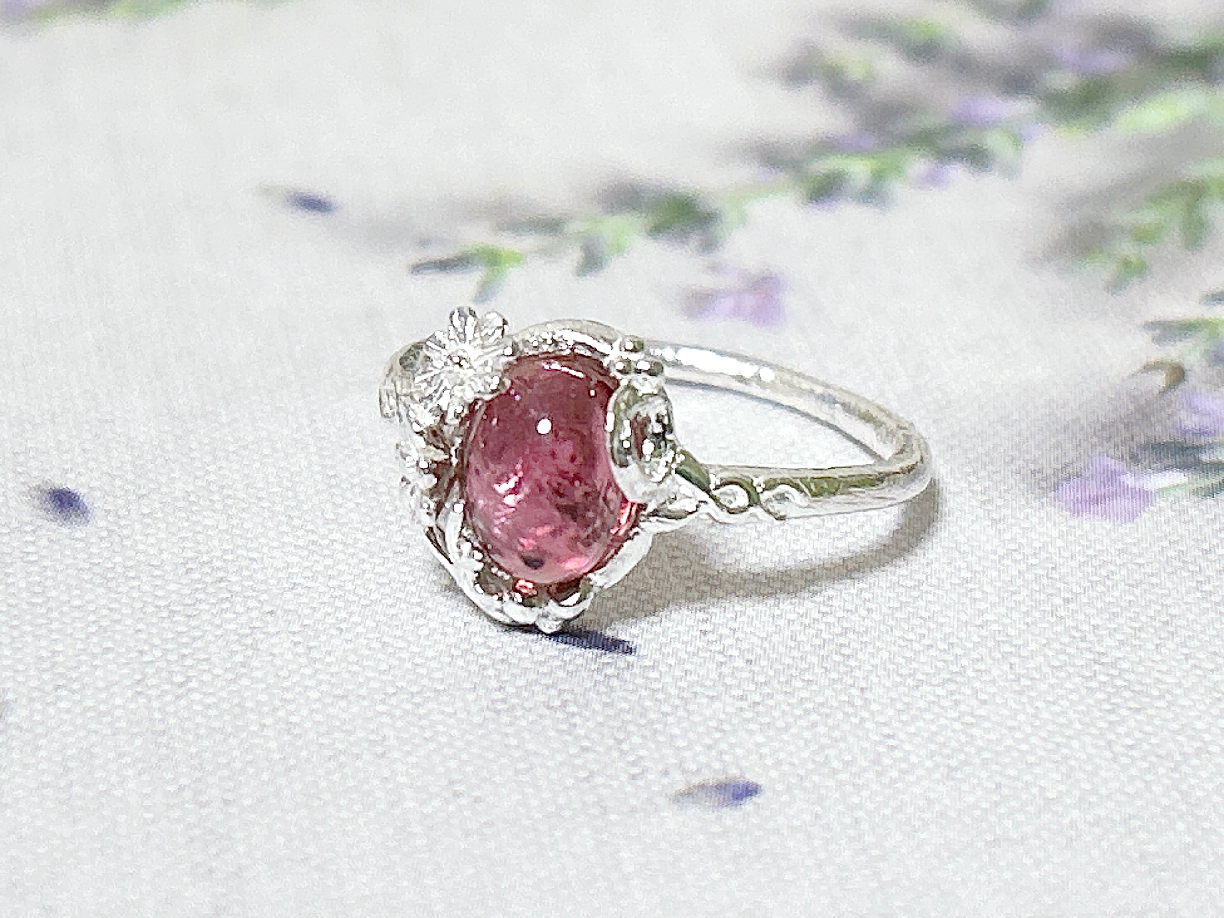 綺麗なピンク色を連想させるコスモスを添えました、ぷっくりと高さのあるトルマリンが存在感を出していてとてもかわいいです。