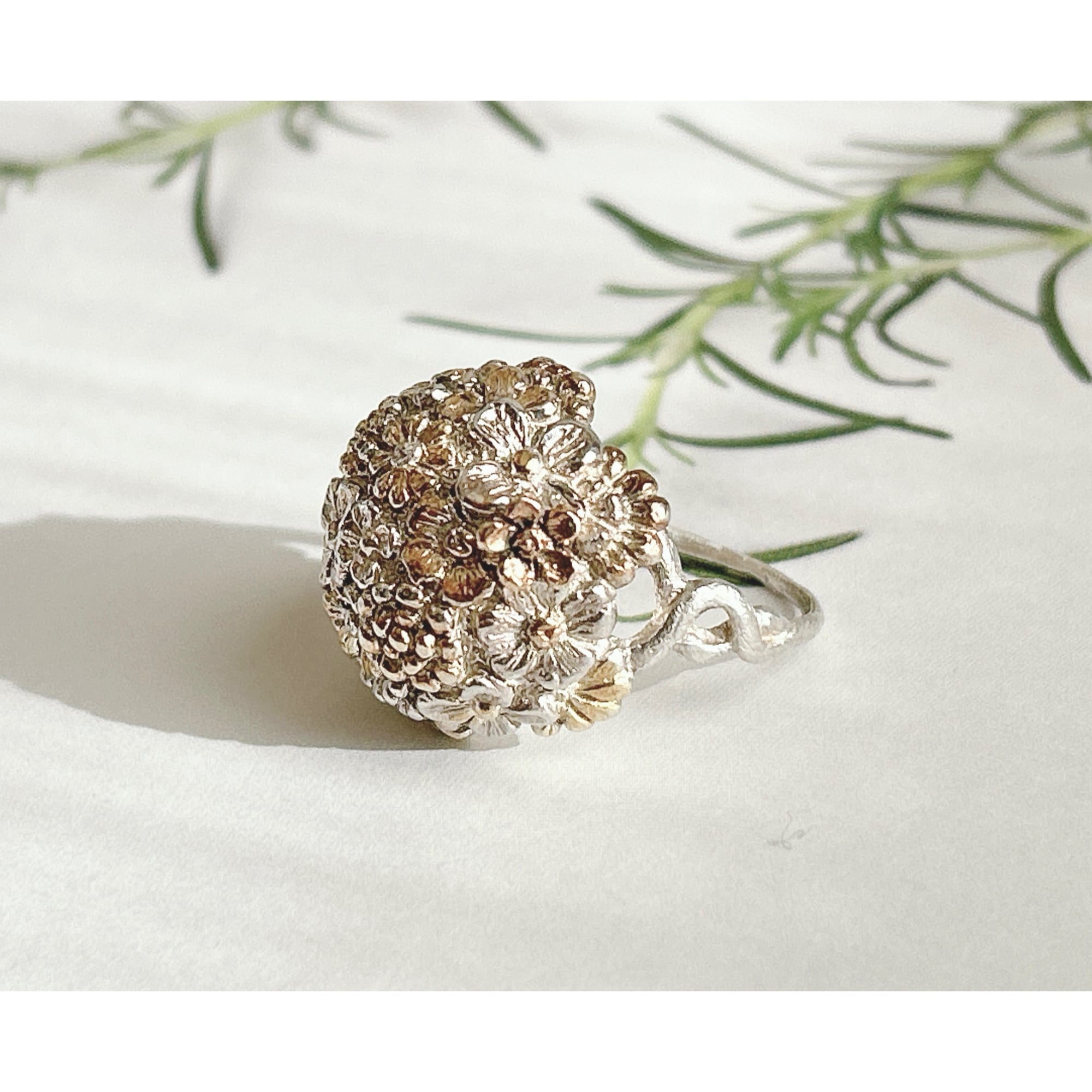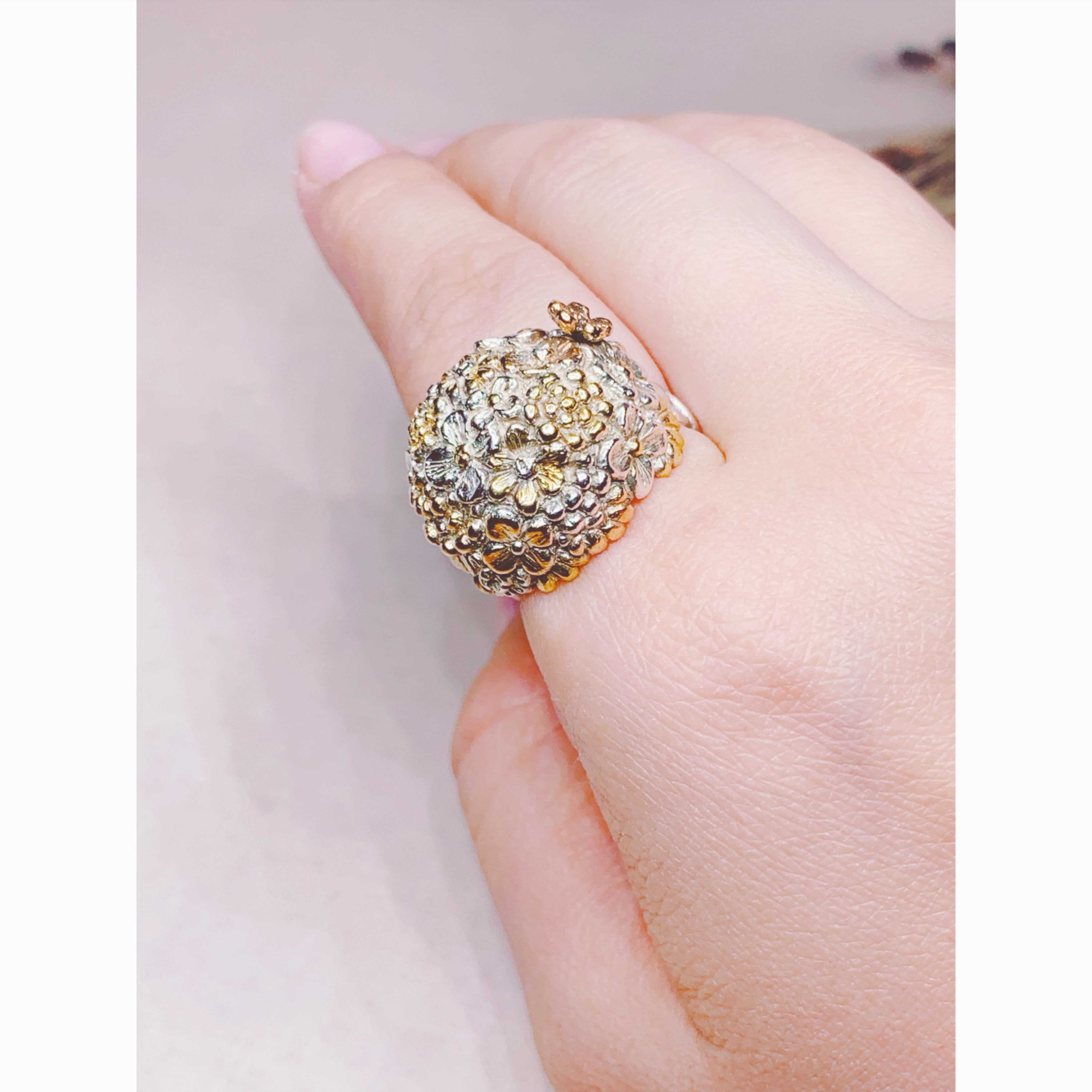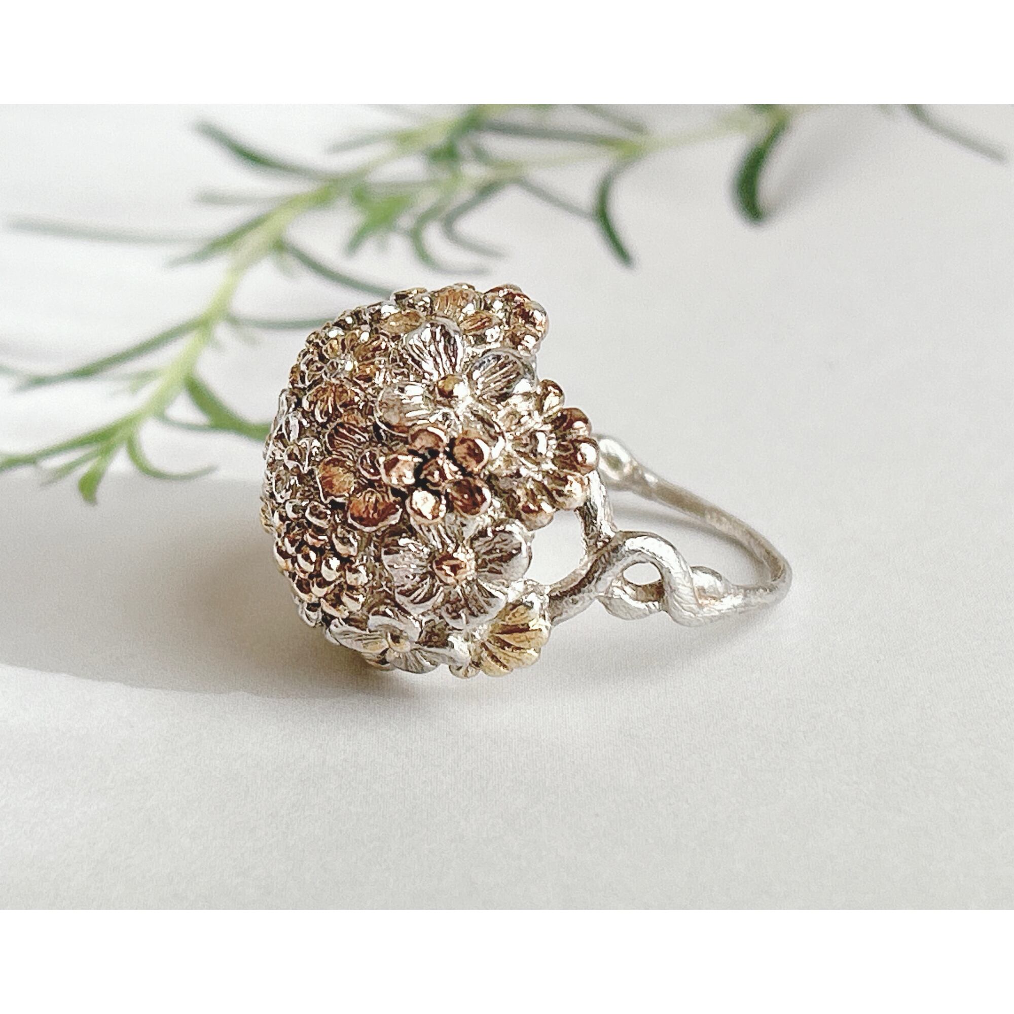 ダリア、ガーベラ、パンジー等をピンクゴールドメッキ、K24メッキで色付けしています。