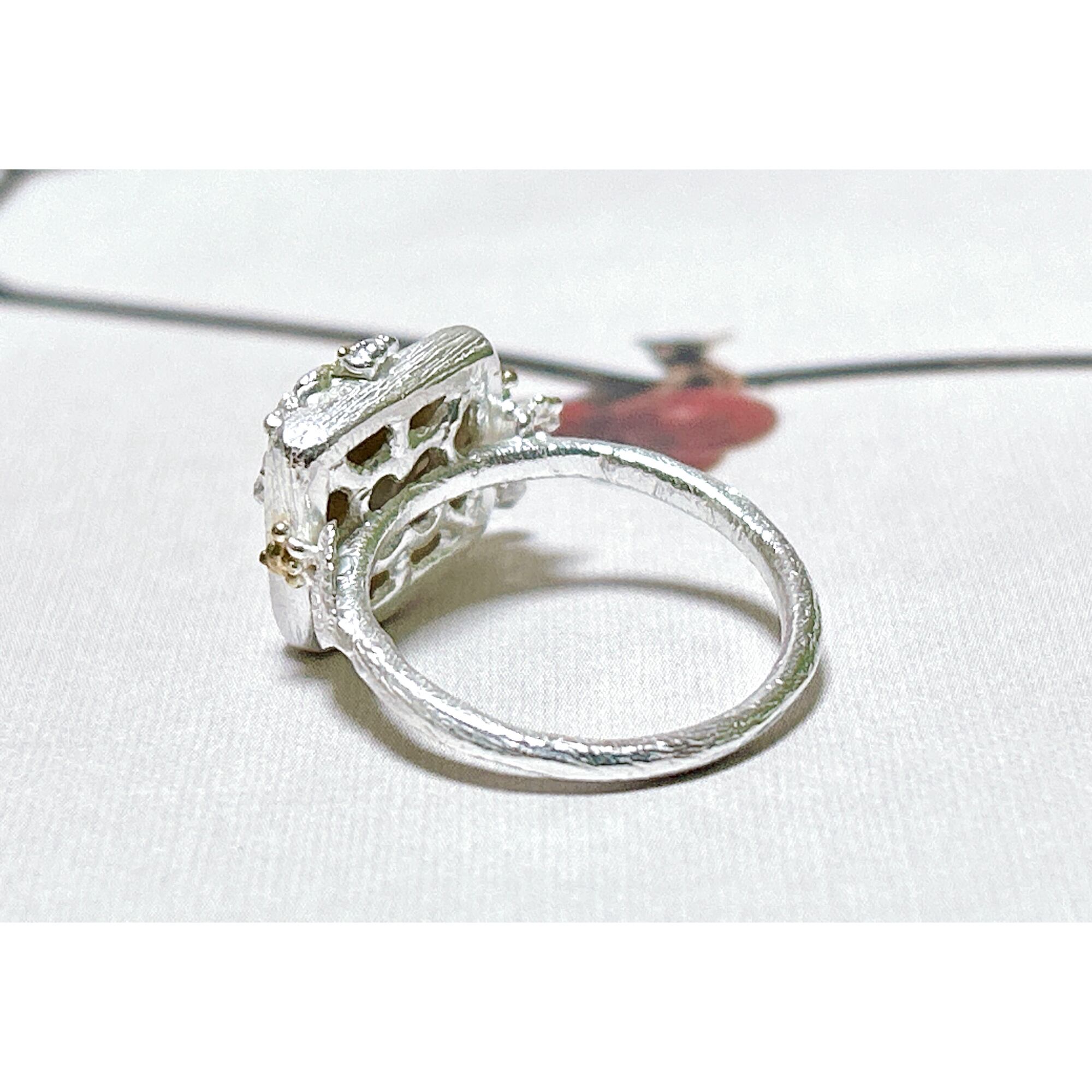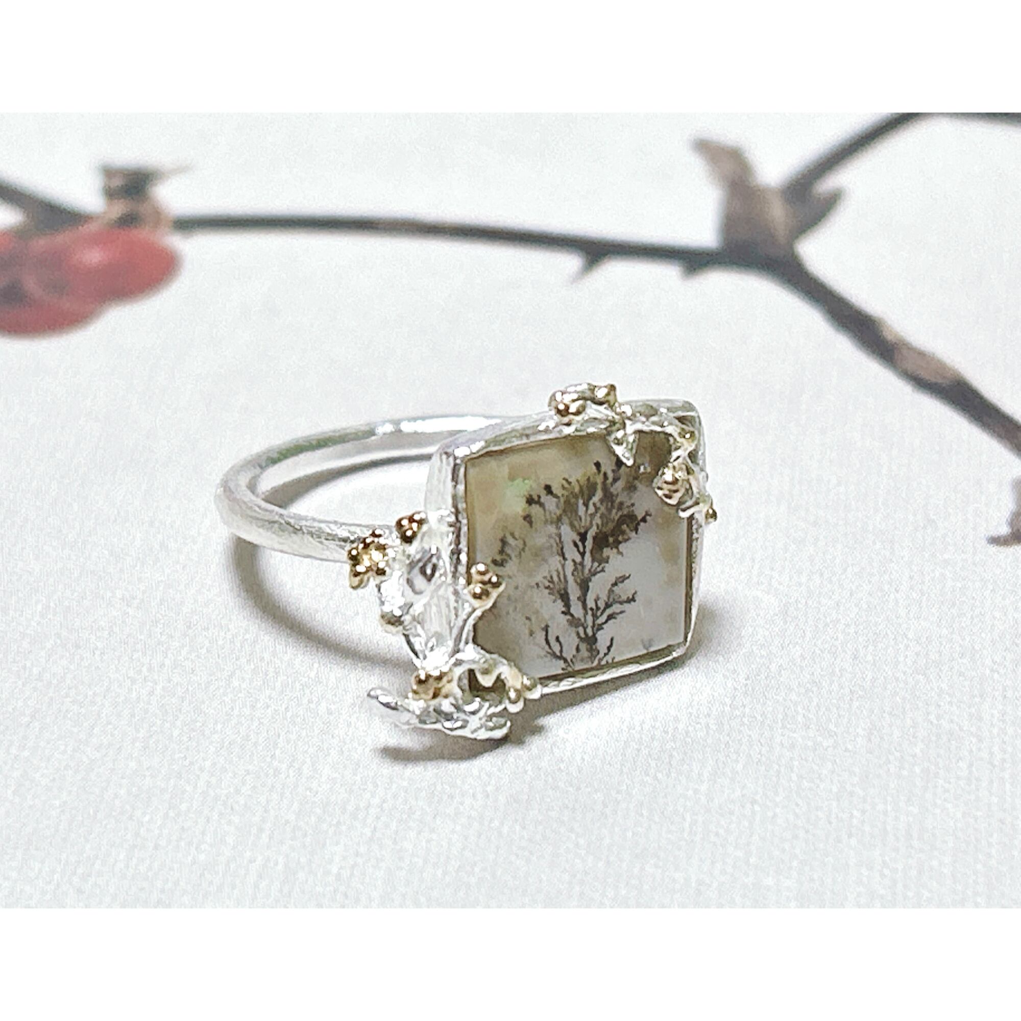 樹木を閉じ込めたような模様のデンドリティックアゲートを、木の葉で包むようなイメージで製作したリングです。
